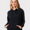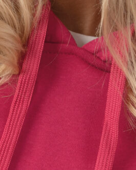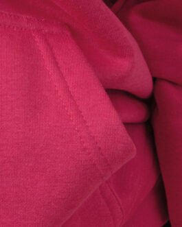 Felpa con cappuccio e tascone a marsupio, cordino cappuccio in tinta e costina 1×1 con lycra su polsini e girovita.