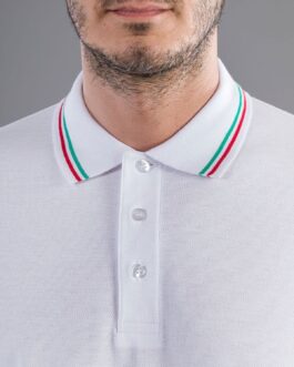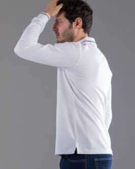 Polo a maniche lunghe set-in, 3 bottoni tono su tono, nastro di rinforzo e bordature tricolore sul collo, costina sulle maniche, struttura con spacchetti e cuciture laterali.